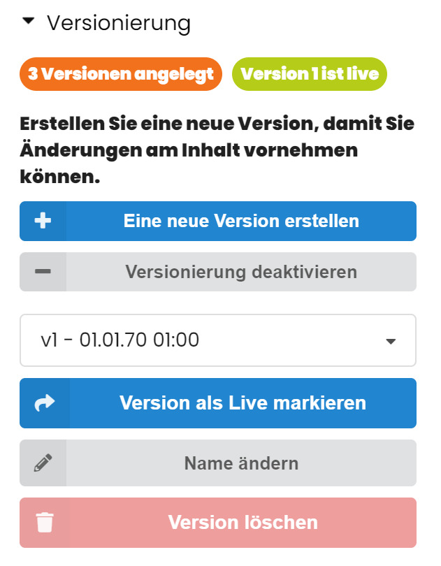 Mit Klick auf die Versionen (Drop-Down) schalten Sie zwischen den Versionen hin und her und können Änderungen vornehmen. Mit Klick auf "Version als Live markieren", stellen Sie die gewünschte Version online.