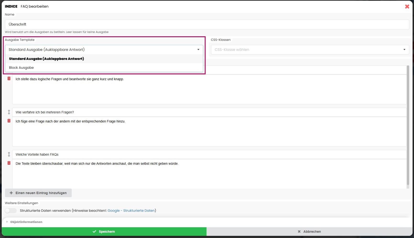 Wenn diese Option aktiviert wird, werden die Fragen und Antworten zusätzlich als strukturierte Daten ausgegeben. Dies hilft Suchmaschinen wie Google, den Inhalt besser zu verstehen und kann dazu beitragen, dass FAQ-Inhalte in den Suchergebnissen hervorgehoben dargestellt werden.