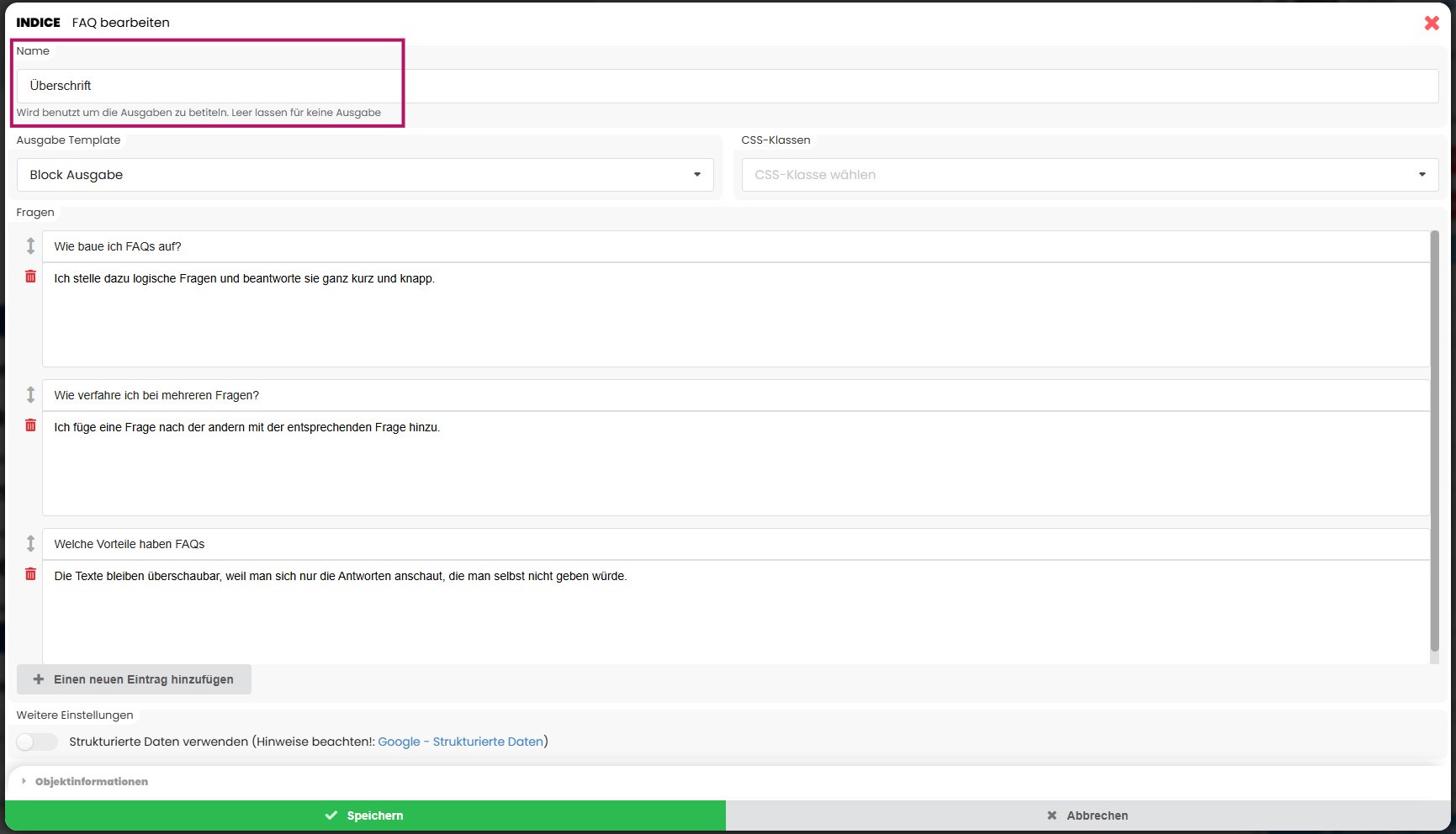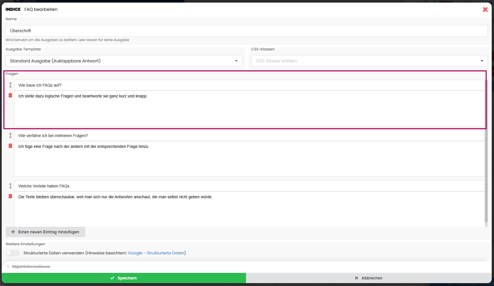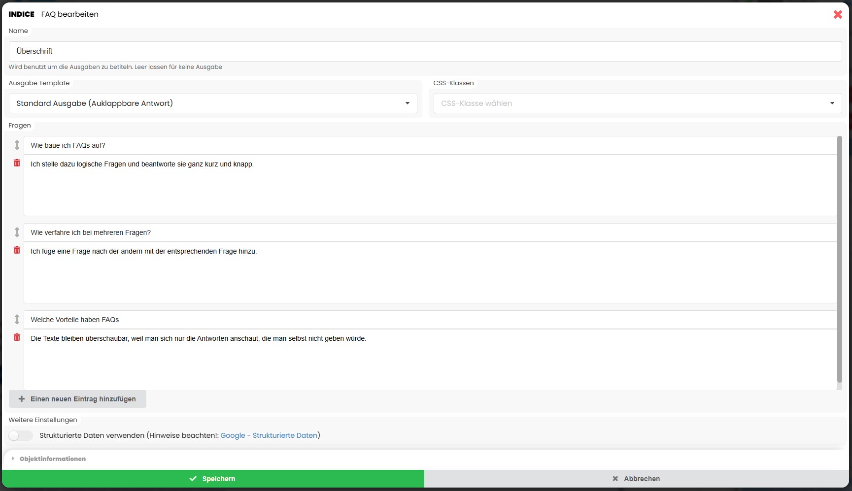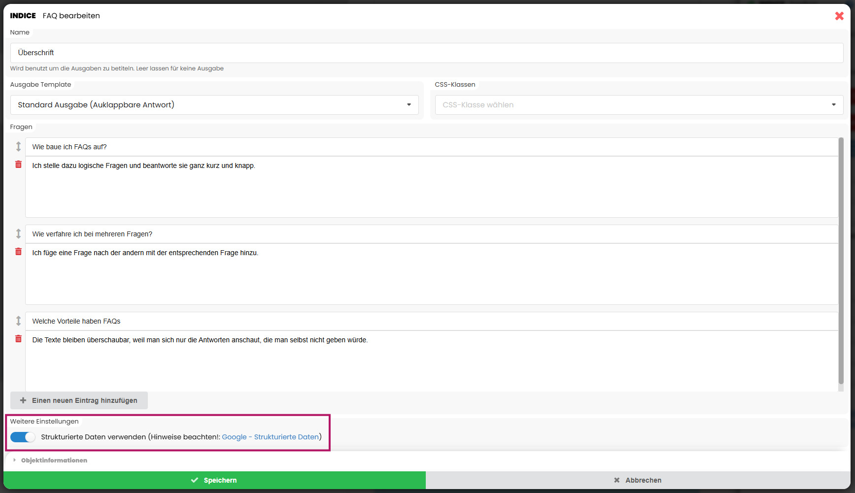 Auch aus SEO-Sicht ist das FAQ-Modul sinnvoll: Häufig gestellte Fragen helfen Suchmaschinen, Inhalte besser einzuordnen. Zusätzlich können, wenn gewünscht, strukturierte Daten aktiviert werden, damit Google die Fragen und Antworten optimal verwerten kann.