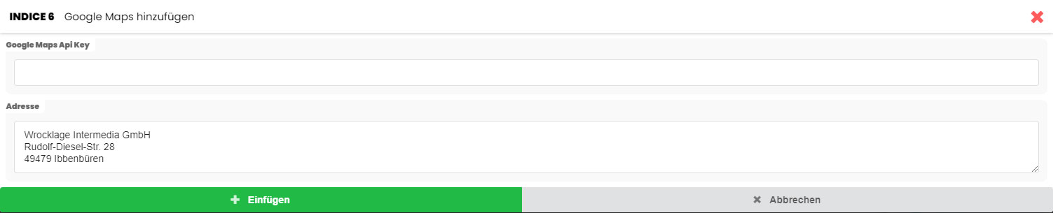 Den Google Maps API Key können Sie unter Ihrer Google Cloud Platform erstellen lassen. In den meisten Fällen ist der Key kostenlos. Wir haben auf unserer Haupt-Seite eine detaillierte Ableitung erstellt: https://www.wrocklage.de/blog/wie-erstelle-ich-einen-google-maps-api-key/