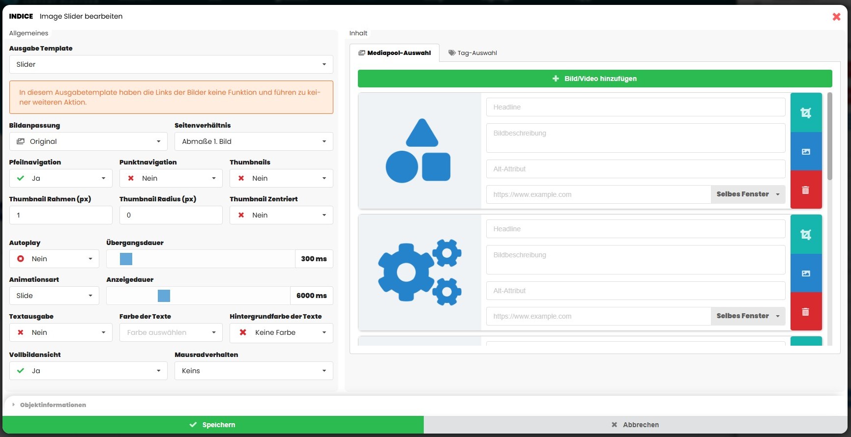 Allgemeine Einstellungen des Image Sliders