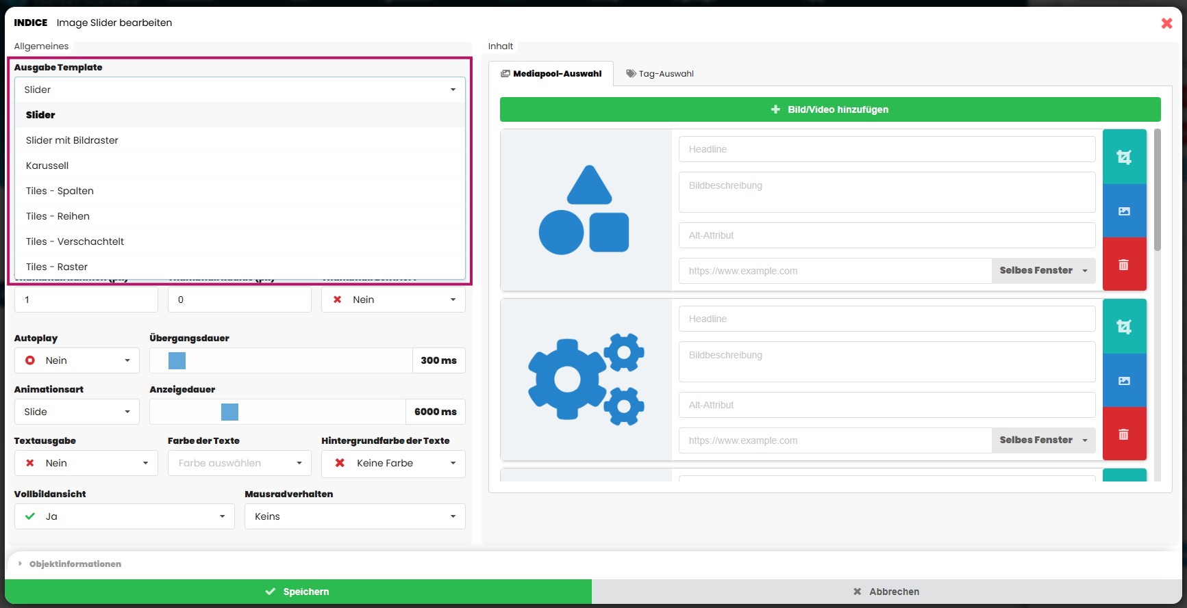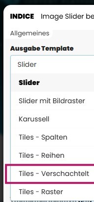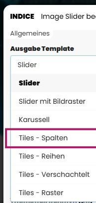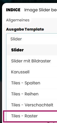 Im Bereich Ausgabe Template wählen Sie aus, wie Ihre Bilder im Slider dargestellt werden sollen. Das Template bestimmt die Optik und die Art der Animation. Je nach Auswahl wirkt der Slider klassisch, als Karussell oder als animiertes Kachelraster.