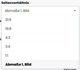 Hier legen Sie fest, in welchem Format der Slider dargestellt wird. Sie können feste Formate wie 21:9 oder 16:9 wählen oder mit „Abmaße 1. Bild“ automatisch das Verhältnis des ersten Bildes übernehmen. Alle weiteren Slides passen sich diesem Format an.