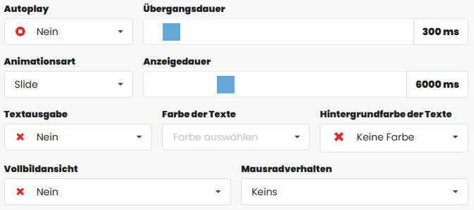 Hier legen Sie fest, wie die Bilder wechseln und wie lange sie sichtbar bleiben. Die Animationsart bestimmt den Übergang, zum Beispiel Slide oder Fade.