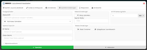 2. Diesen Layoutbereich bearbeiten Sie und gehen auf den Reiter "Spezielle Einstellungen". Hier gebe Sie dem Layoutbereich eine eindeutige Überschrift (z.B. "Unsere Leitwerte"). Dann wechseln Sie direkt darunter von "Normales Verhalten" zu "Als Popup verfügbar machen". Anschließend speichern und schließen.