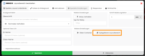 Schritt 1: Kennzeichen Sie den Layoutbereich, der als Original dienen soll, als "spiegelbaren Layoutbereich". Dies ist dann der Original-Layoutbereich, in dem später auch Änderungen vorgenommen werden können. Gehen Sie dazu in den Tab "Spezielle Einstellungen" und klicken Sie "Spiegelbarer Layoutbereich" an.