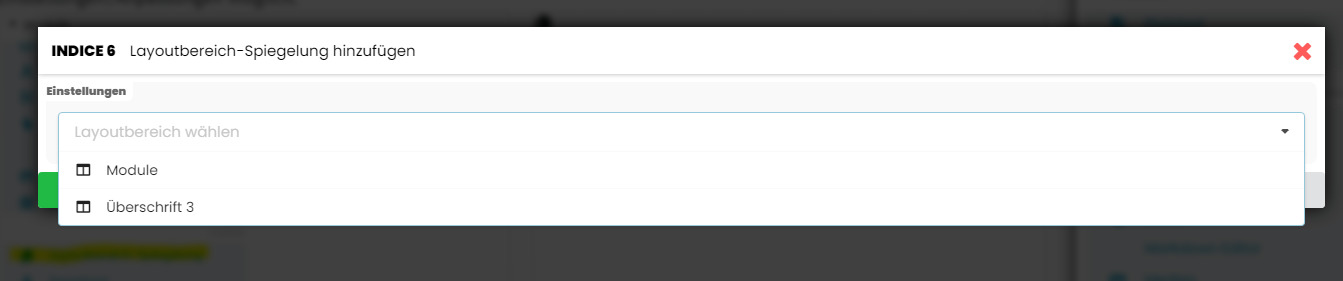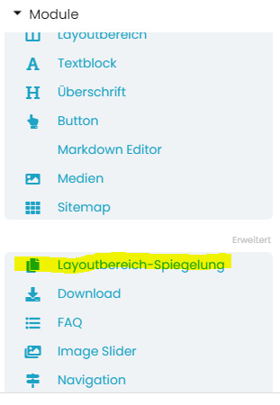 Schritt 2: Auf den Seiten, auf denen Sie nun eine Kopie (eine Spiegelung/Klon) einfügen wollen, wählen Sie das Modul "Layoutbereich-Spiegelung" und fügen die gewünschte Spiegelung hier ein. Sollten mehrere Spiegelungen vorhanden sein, können Sie mit dem Dropdown das gewünschte Orginal auswählen. Bei der Spiegelung selber sind keine Einstellungen/Anpassungen möglich.