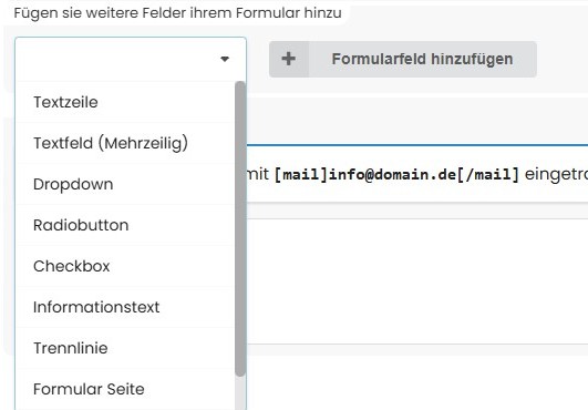 Über das Dropdown-Menü wählen Sie den gewünschten Feldtypen (z. B. Textzeile, Dropdown, Checkbox, Informationstext) aus.