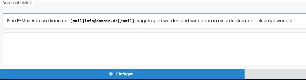 Hier können Sie einen individuellen Datenschutzhinweis eintragen. E-Mail-Adressen im Format [mail]info@domain.de[/mail] werden automatisch in klickbare Links umgewandelt.