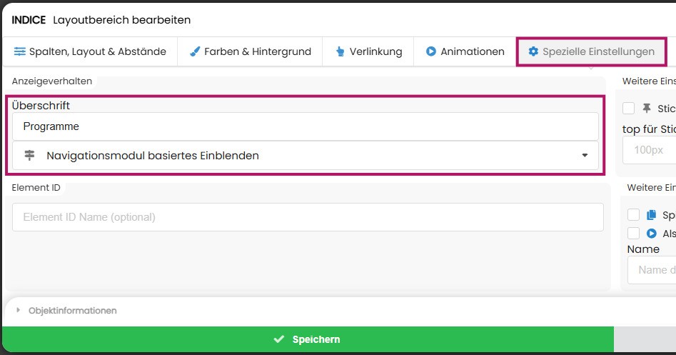 Jeder Layoutbereich, der später über die Navigation ein- oder ausgeblendet werden soll, erhält unter Spezielle Einstellungen die Option Navigationsmodul basiertes Einblenden als Anzeigeverhalten. Zusätzlich vergeben Sie eine eindeutige Überschrift oder einen Namen für den Layoutbereich. Dieser Name wird später in der Navigation als Bezeichnung verwendet.