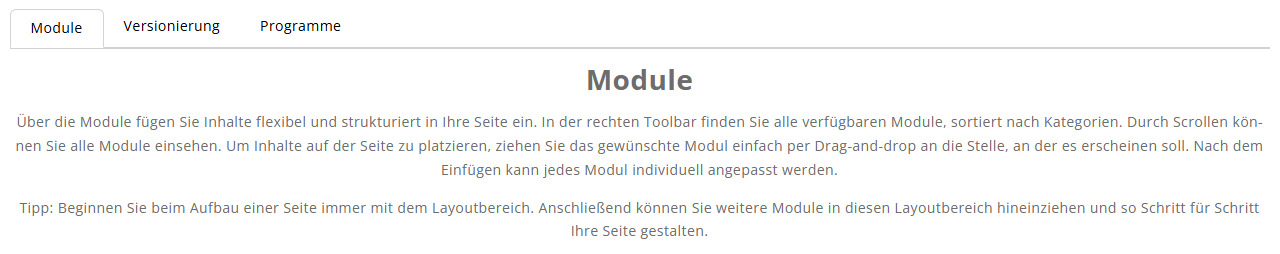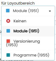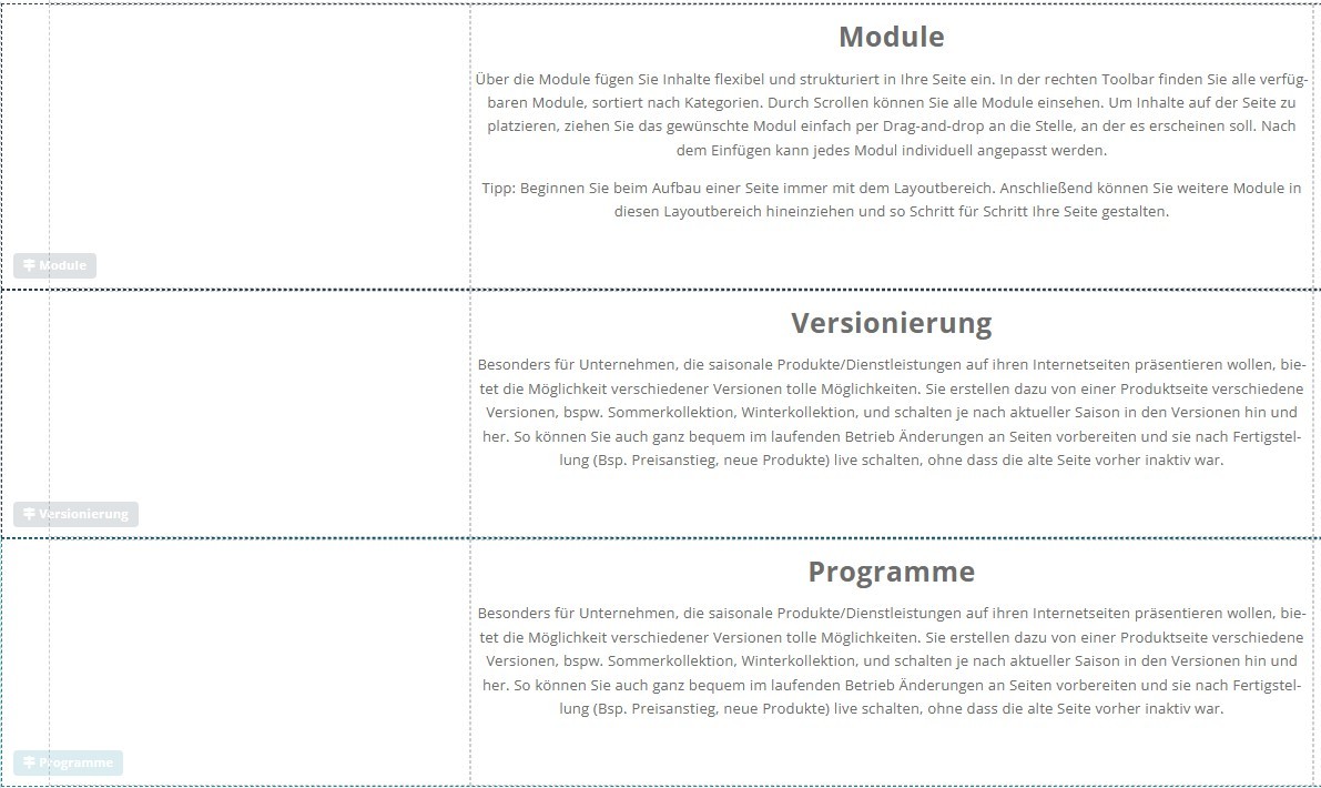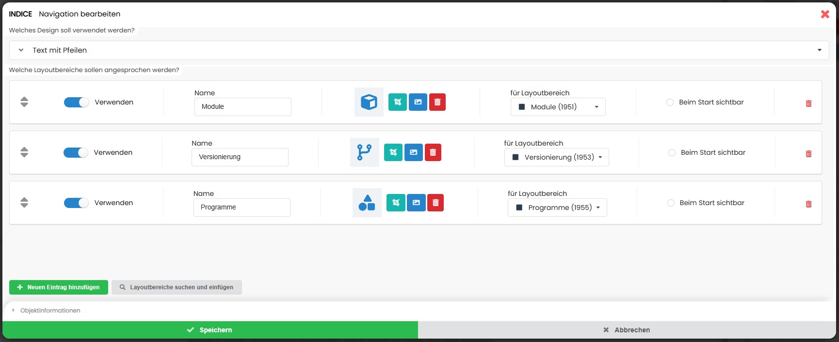 Jeder Eintrag innerhalb des Moduls steht für einen Layoutbereich, dessen Inhalt später per Klick ein- oder ausgeblendet wird. Auch die Reihenfolge kann über die Pfeile ganz links verändert werden.