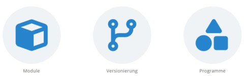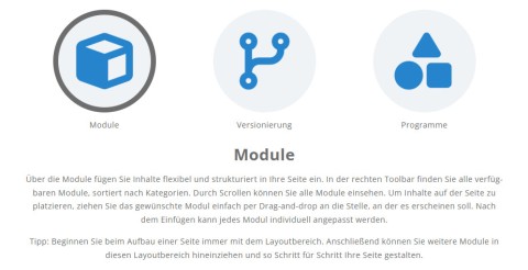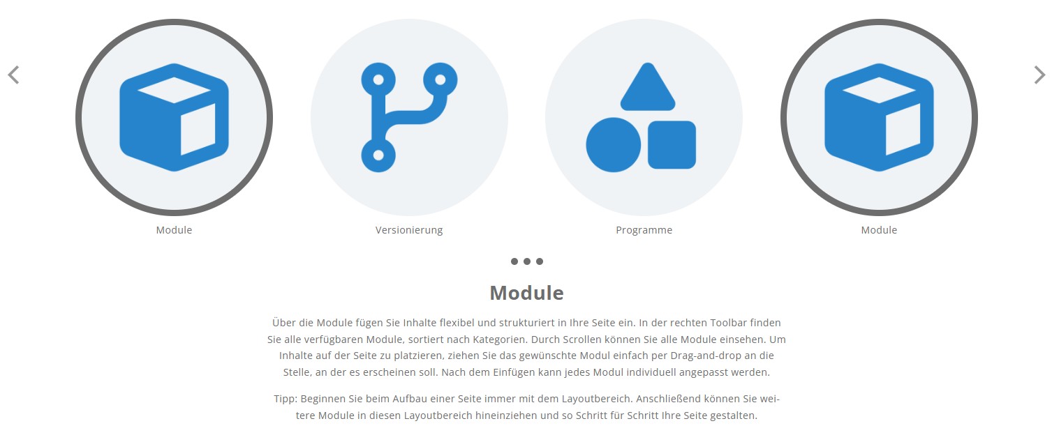 Der aktive Layoutbereich ist durch eine deutliche Umrandung hervorgehoben. Mit einem Klick auf ein rundes Bild wird der zugehörige Layoutbereich eingeblendet, alle anderen Inhalte werden ausgeblendet.