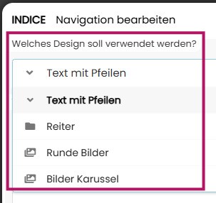 Im oberen Bereich des Moduls wählen Sie das grundsätzliche Design der Navigation, z. B. Text mit Pfeilen, Reiter oder Bilderkarussell. Das Design bestimmt ausschließlich die optische Darstellung und Interaktion der Navigation, nicht die Inhalte selbst.