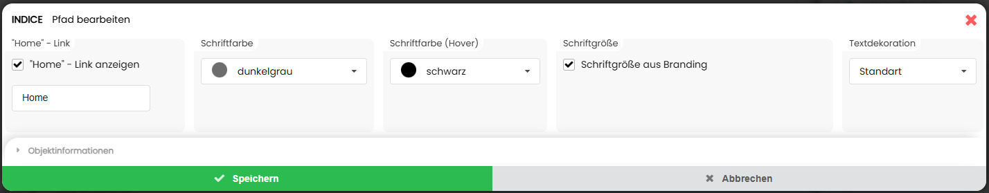 Ist diese Option aktiviert, übernimmt der Seitenpfad automatisch die im Branding hinterlegte Schriftgröße. So bleibt die Darstellung einheitlich und entspricht den globalen Gestaltungsvorgaben.