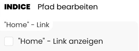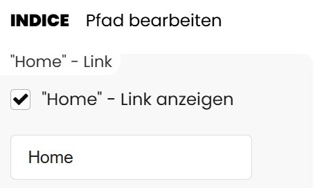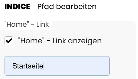 Ist die Einstellung aktiviert, wird am Anfang des Pfads ein klickbarer Eintrag angezeigt, der auf die Startseite verweist. Der Text des Links kann individuell angepasst werden.