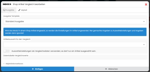Mit diesem Modul können Sie die Informationen von mehreren Produkten, jeweils die Auswahleinstellungen und aus der Datenballe, dem Benutzer gegenüberstellen. In der Artikelbearbeitung muss dazu angegeben werden welche Information dazu qualifiziert sind. Das Modul kann allgemein verwendet werden, dazu müssen dann die betroffenen Artikel direkt ausgewählt werden, es kann aber auch auf einer Shop Artikel Seite verwendet werden bei der Optional mit anderen Artikeln oder aber die verschiedenen Auswahl einstellungen Dargestellt werden.