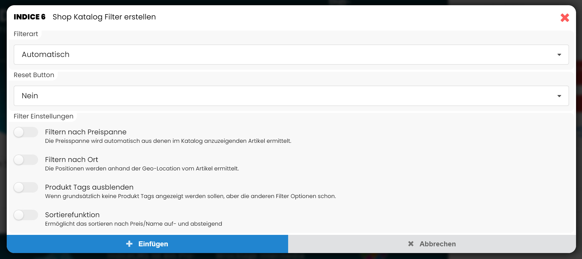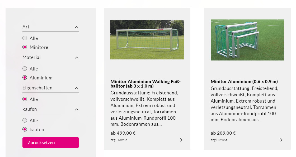 Beispiel des angewendeten Shopkatalog-Filters nach Marke und Produktart.