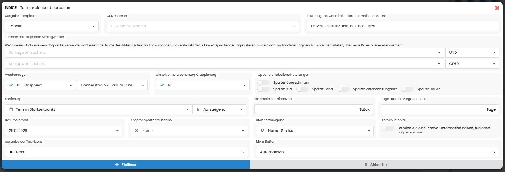 Dieses Modul greift auf das Programm Termine zu. Dort werden Veranstaltungen zunächst angelegt und mit passenden Schlagworte (Tags) versehen. Im Modul können Sie anschließend gezielt auswählen, welche Termine auf Ihrer Website ausgegeben werden sollen: z. B. gefiltert nach bestimmten Schlagworten.