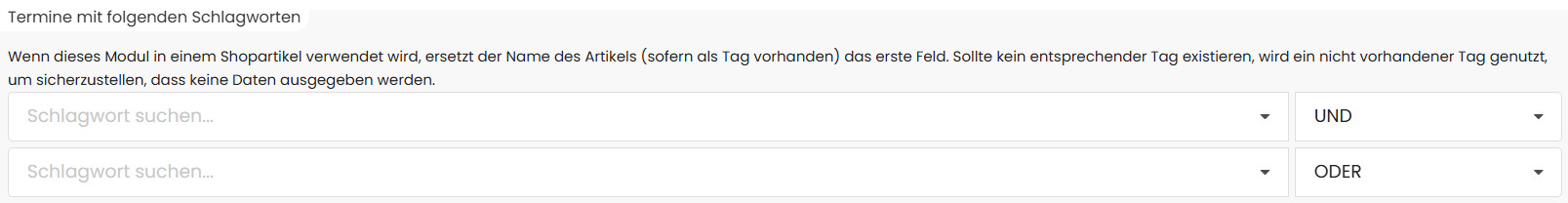 Hier wählen Sie aus, welche Termine angezeigt werden sollen. Sie können ein oder mehrere Schlagworte auswählen und diese verknüpfen: