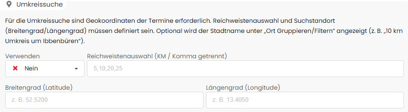 Mit der Umkreissuche können Besucher Termine nach Entfernung filtern (z. B. „alle Termine im Umkreis von 10 km“).