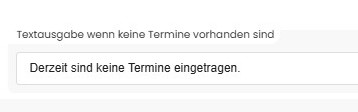 Hier können Sie einen Hinweistext hinterlegen, der erscheint, wenn keine passenden Termine gefunden wurden (z. B. „Derzeit sind keine Termine eingetragen.“).
