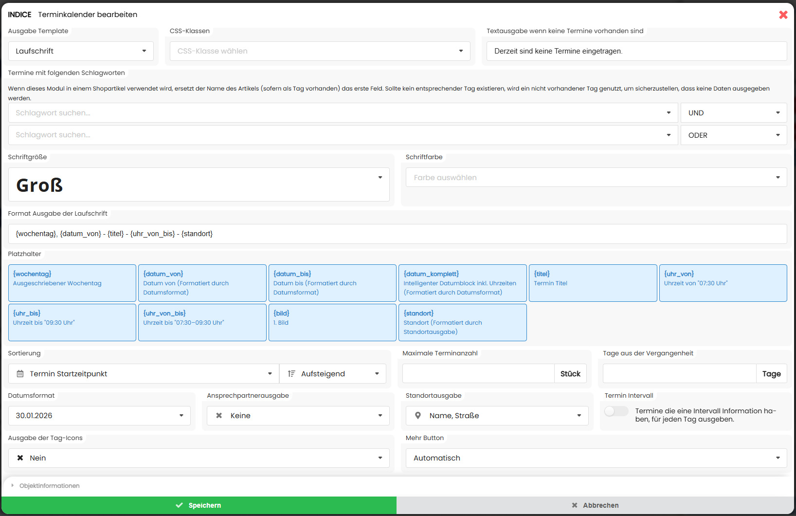 Unter Format Ausgabe der Laufschrift legen Sie fest, in welcher Reihenfolge die Terminangaben in der Laufschrift angezeigt werden.