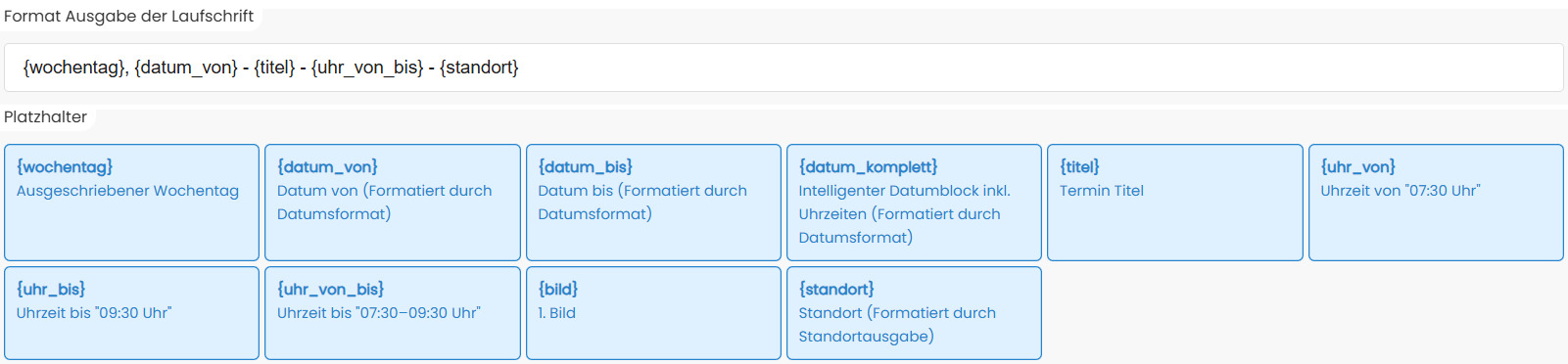 Dafür verwenden Sie Platzhalter, die automatisch durch die jeweiligen Termininhalte ersetzt werden (z. B. Titel, Datum, Uhrzeit oder Standort).{wochentag}
