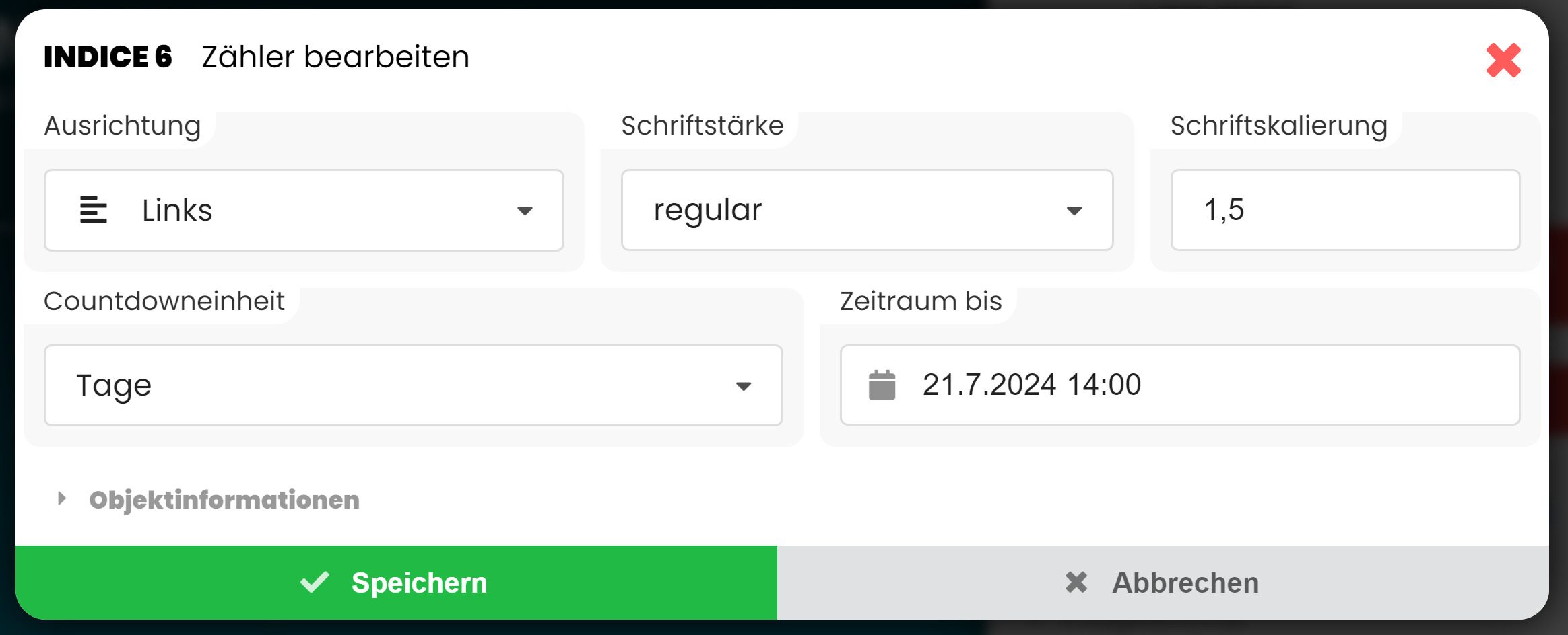 Mit diesem Mobul wird eine Zeiteinheit (Jahre, Monate, Tage, Stunden, Sekunden) bis zu einem gewählten Datum mit Uhrzeit heruntergezählt.