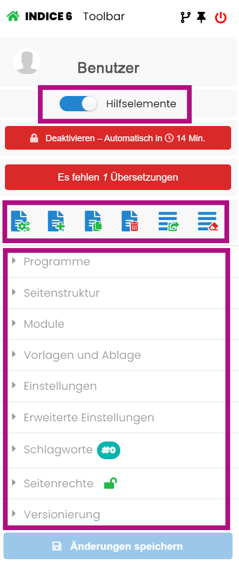 Diese Icons in der Toolbar helfen Ihnen, schnell die im Moment aufgerufene Seite zu bearbeiten (kopieren, löschen, verschieben).