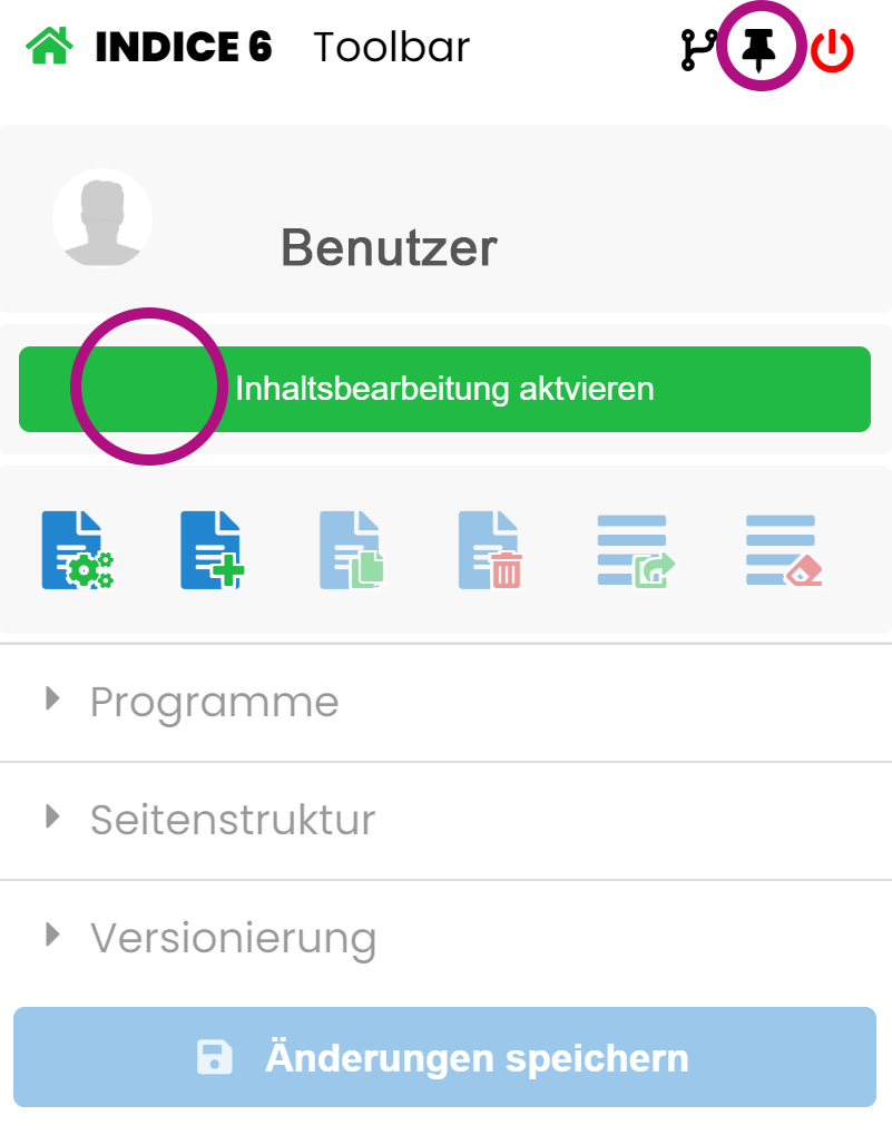 Ein Klick auf den grünen Button aktiviert die Inhaltsbearbeitung, sodass nun alle Systemfunktionen aufgelistet werden.