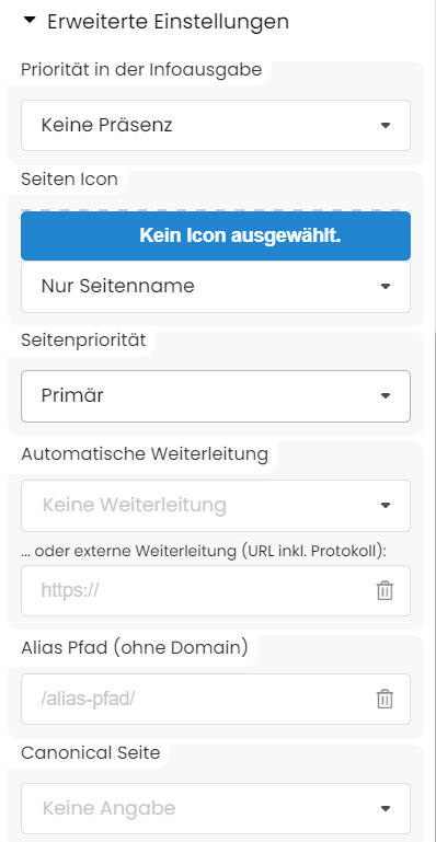 In manchen Fällen ist es sinnvoll, dass eine Seite automatisch zu einer anderen Ziel-Seite verlinkt ist. Die Seite selber hat dann keinen Inhalt. Mit dem Dropdown wählen Sie die gewünschte Seite aus. Alternativ können Sie auch zu einer externen Seite weiterleiten. Hierzu tragen Sie die komplette URL inkl. Protokoll ein (Bsp. https://www.wrocklage.de). Bitte nutzen Sie diese Funktion sehr sparsam, da Sie leicht den Überblick verlieren könnten. (Erklärung: Sie können die Weiterleitung nur testen, wenn Sie die Inhaltsbearbeitung wieder deaktiviert haben)