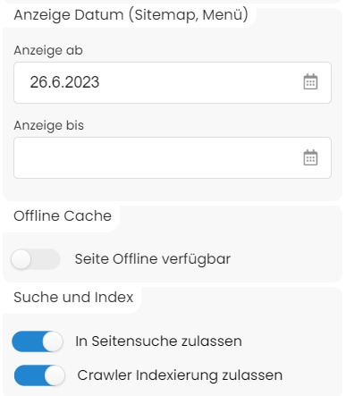 Schränken Sie die Anzeige einer Seite zeitlich ein. Sie können eine Endedatum und/oder ein Startanzeigedatum festlegen. Die Seite ist danach sowohl im Menü als auch in den Sitemaps nur im definierten Zeitraum für Seitenbesucher sichtbar.