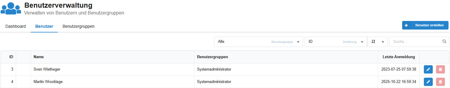 Über das Register Benutzer sehen Sie alle im System vorhandenen Benutzer, deren zugewiesene Gruppen und die letzte Anmeldung. Jeder Benutzer kann über die Schaltflächen am rechten Rand bearbeitet oder gelöscht werden. Mit Benutzer erstellen legen Sie neue Benutzer mit individuellen Berechtigungen an.