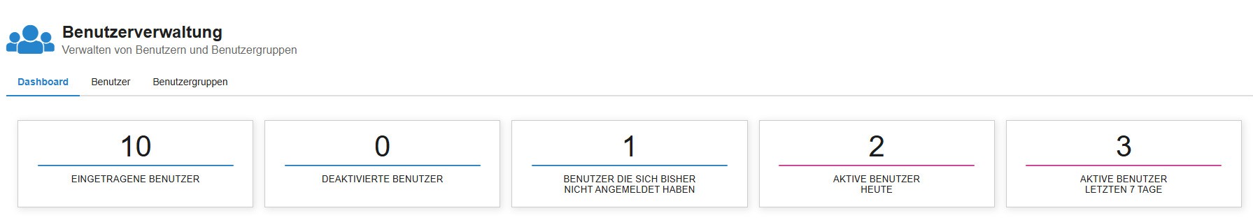 Im Dashboard erhalten Sie eine Übersicht über die aktuelle Nutzung: Anzahl der eingetragenen, aktiven und deaktivierten Benutzer sowie Anmeldestatistiken der letzten Tage.