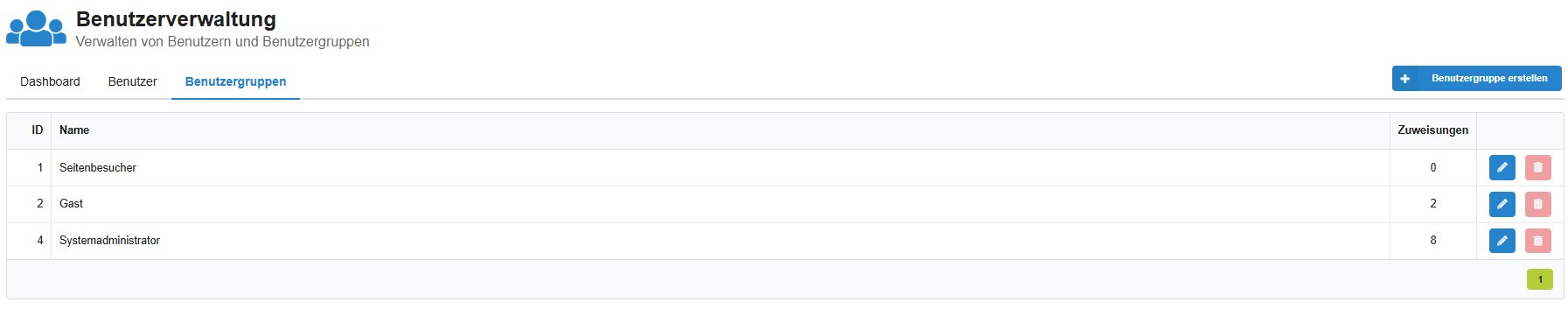 Im Register Benutzergruppen werden Gruppen mit ihren jeweiligen Zuweisungen angezeigt. Hier können Sie neue Gruppen anlegen, bestehende bearbeiten oder löschen. Benutzergruppen erleichtern die Vergabe gemeinsamer Zugriffsrechte.