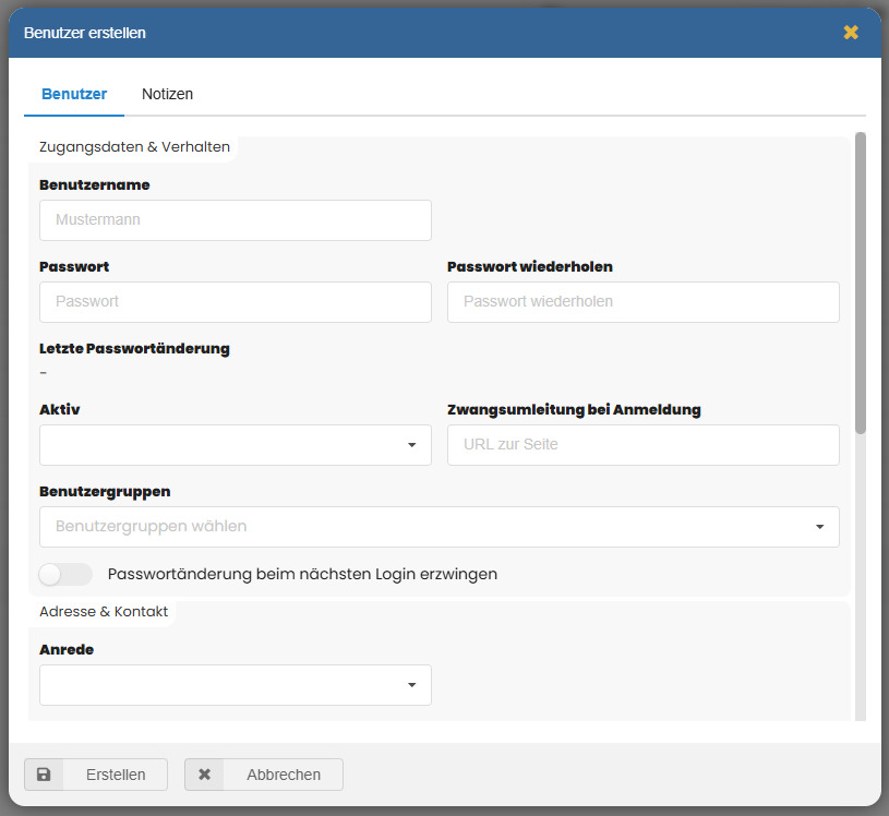 Über Benutzer erstellen legen Sie neue Zugänge an. Tragen Sie Benutzername, Passwort und Kontaktdaten ein und ordnen Sie den Benutzer einer Gruppe zu.