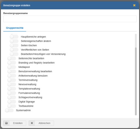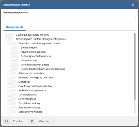 Beim Erstellen einer Benutzergruppe legen Sie fest, welche Rechte und Funktionen für alle Mitglieder gelten. Über die Gruppenrechte bestimmen Sie, auf welche Bereiche und Aktionen die Gruppe zugreifen darf.