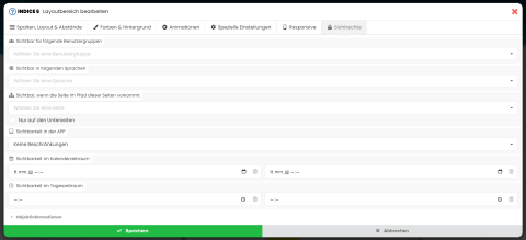 Benutzergruppen lassen sich auch zur Steuerung von Sichtrechten in Layoutbereichen nutzen. Im Register Sichtrechte wählen Sie, welche Gruppen, Sprachen oder Seiten Zugriff auf einzelne Inhalte haben.