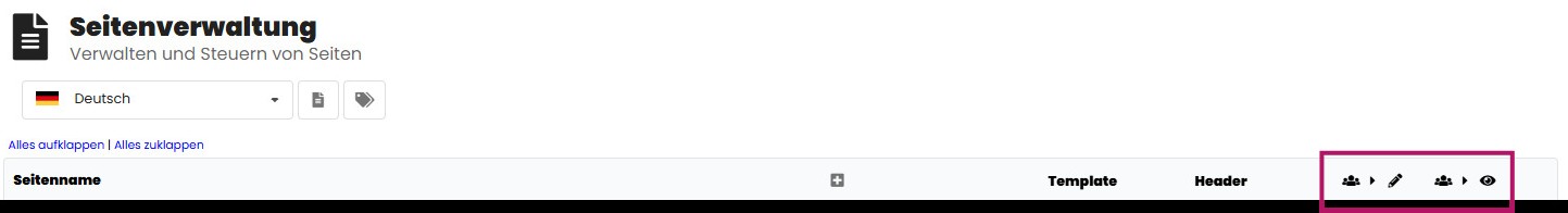In der Seitenverwaltung können Sie über die rechte Symbolleiste festlegen, wer Seiten sehen, bearbeiten oder verwalten darf. So steuern Sie gezielt die Zugriffsrechte einzelner Benutzer oder Benutzergruppen.