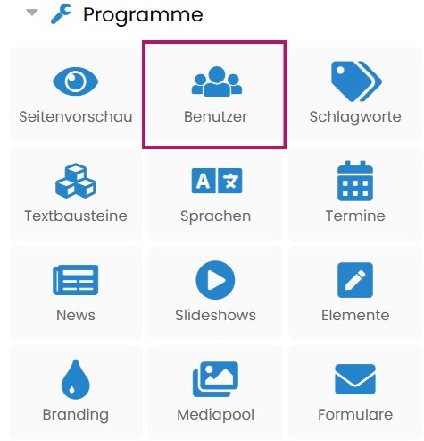 Unter dem Hauptreiter Programme finden Sie das Tool Benutzer. Mit der Benutzerverwaltung steuern Sie, welche Personen Zugriff auf Ihre Website haben und welche Rechte sie besitzen. Sie können Benutzer anlegen, bearbeiten, deaktivieren oder Benutzergruppen verwalten.