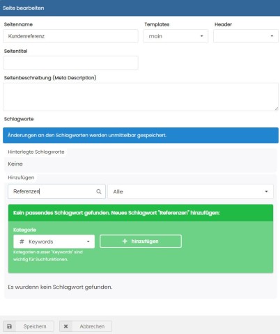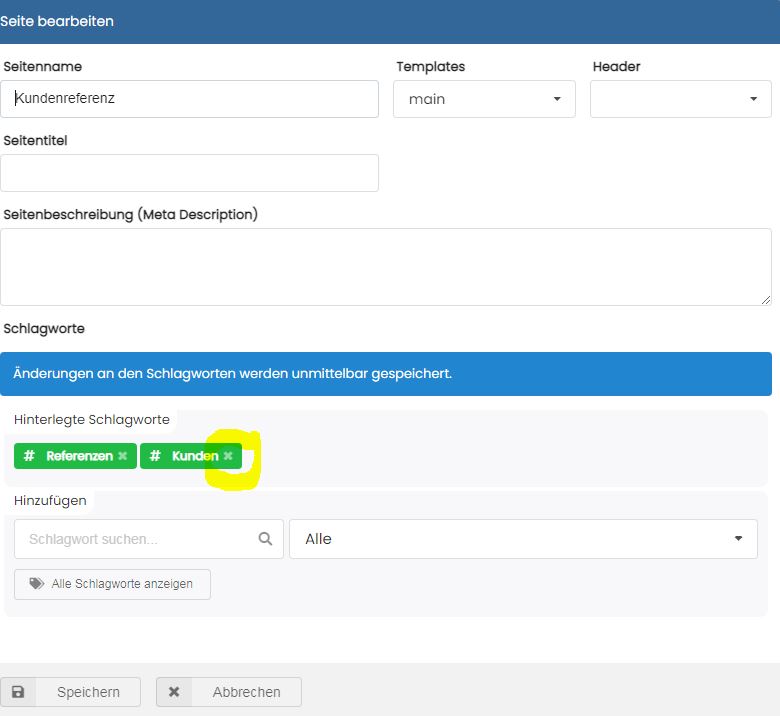 Die Zuweisung von Schlagwörtern erfolgt direkt auf der Seite über die Toolbar - Schlagworte. Ein kleiner Hashtag-Button zeigt an, ob und wie viele Schlagwörter bereits der Seite zugewiesen wurden. Weitere Schlagwörter lassen sich direkt über die Toolbar anlegen und zuweisen. Dazu wählt man entweder bereits vorhandene Schlagwörter aus oder legt sie dort an. Für das Neuerfassen von Schlagwörtern klappt ein grünes Eingabefenster auf.