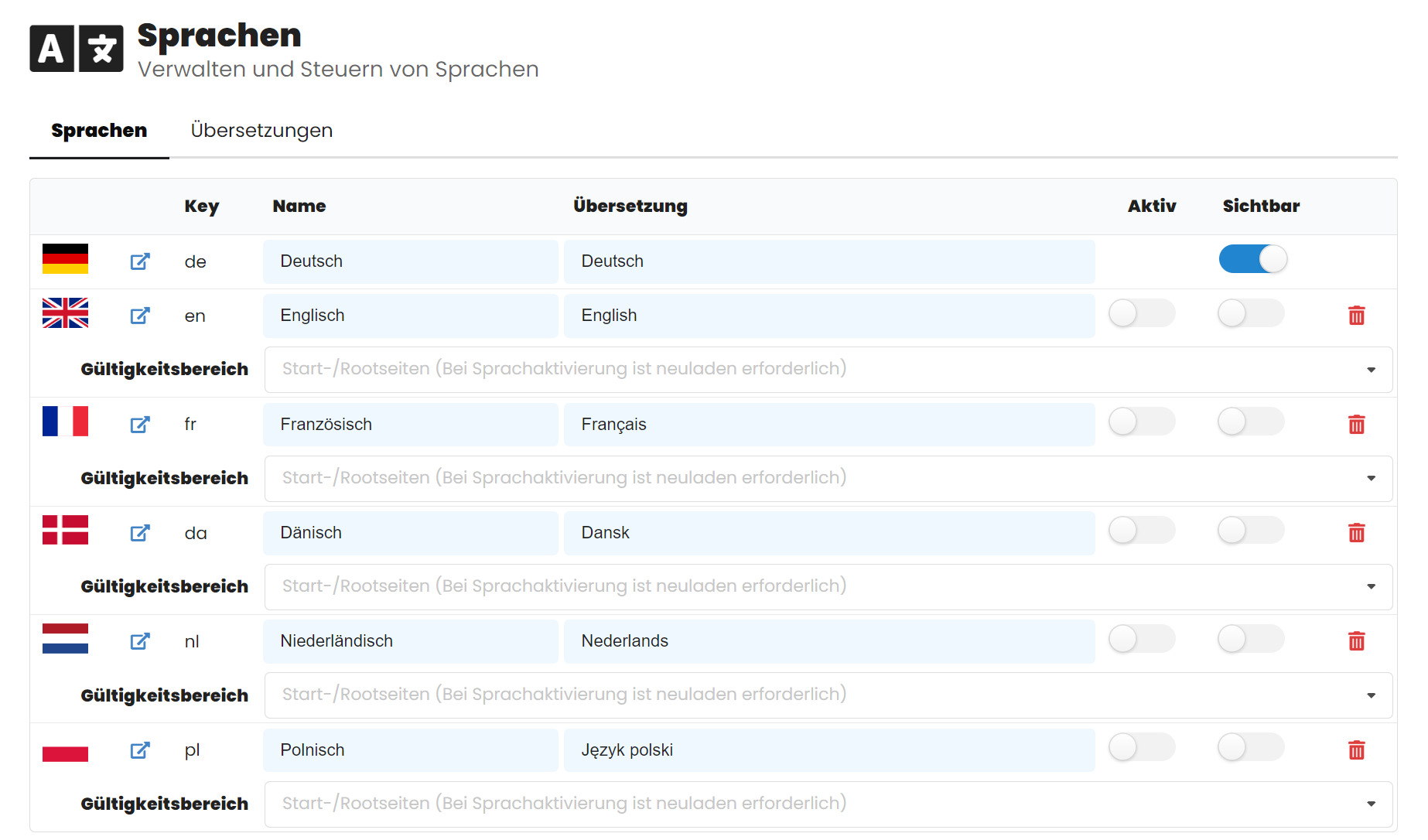 Wird eine Sprache aktiv geschaltet, wird die Startseite erstellt sofern diese noch nicht vorhanden ist. Beim deaktivieren wird diese nicht gelöscht. Sichtbar schalten einer Sprache bedeutet, das diese in der Sprachauswahl erscheint sofern die Auswahl im Design vorhanden ist. Ist diese Unsichtbar, so kann diese dennoch aufgerufen werden.